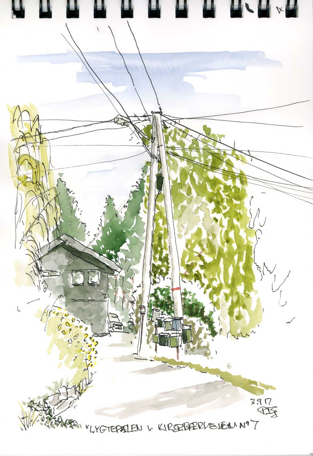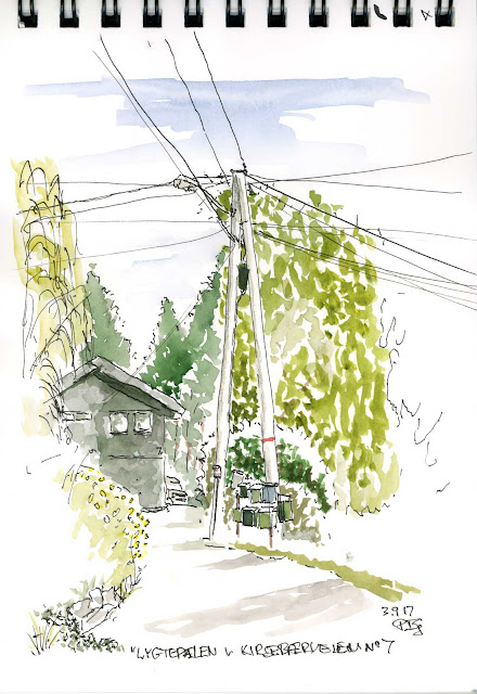 I dag er skitsen lavet i en A5 skitsebog fra Fabriano med en Sailor fyldenpen, og farvelagt på stedet med en Pentel waterbrush og St Petersborg akvareller ...