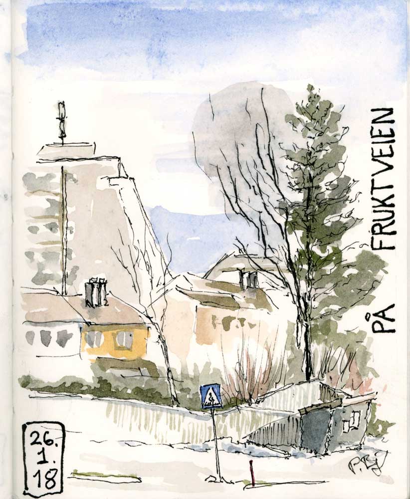 På den første stod jeg på gangbroen over Hånesveien ... bydelens "hovedvej" ... med udsigt til vejen under broen og en boligblok på "Plommeveien" i baggrunden. Forgrunden på skitsen er kanten af broen jeg står på ( limtræ og galvaniserede rør som gelænder ).